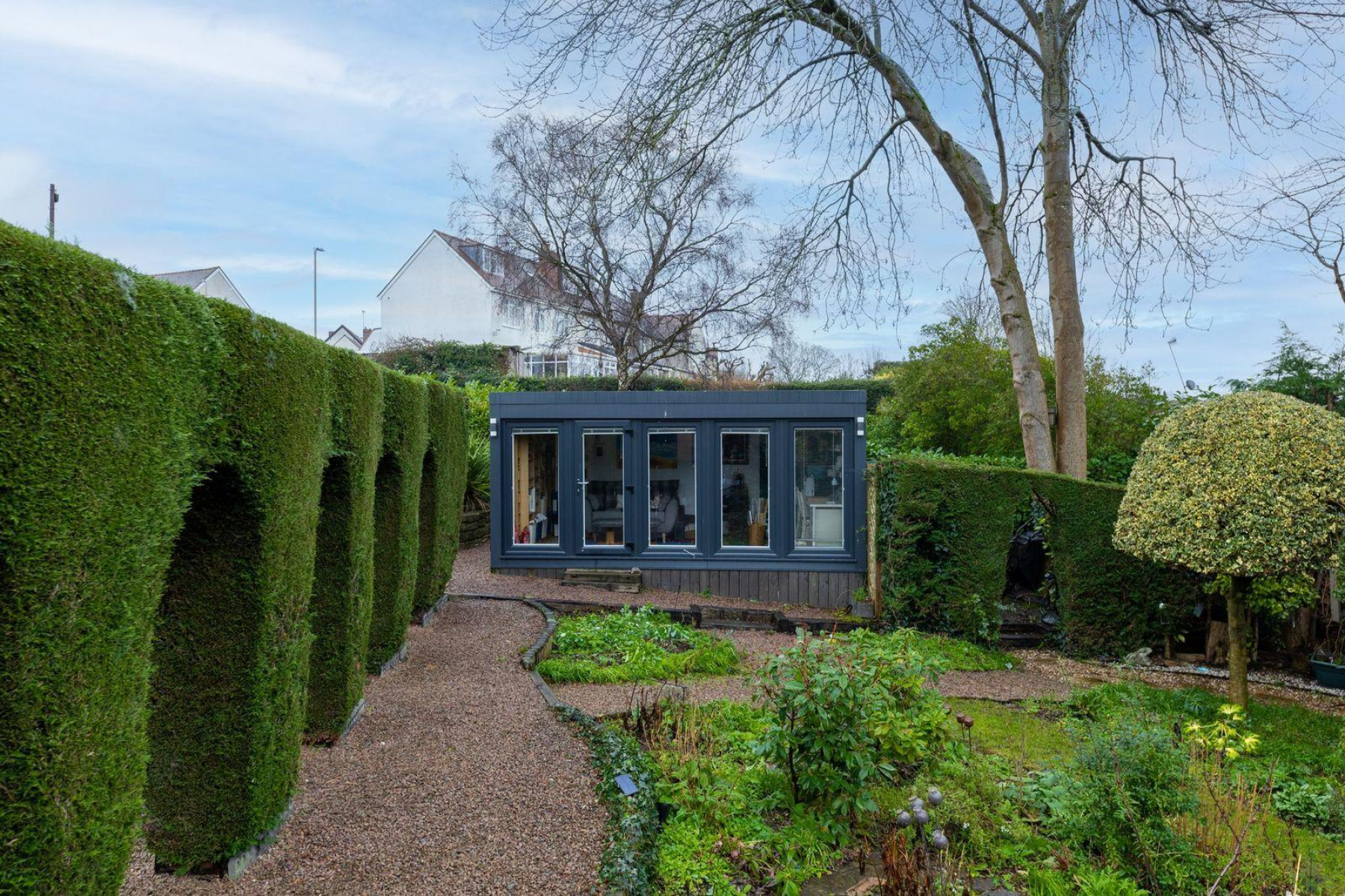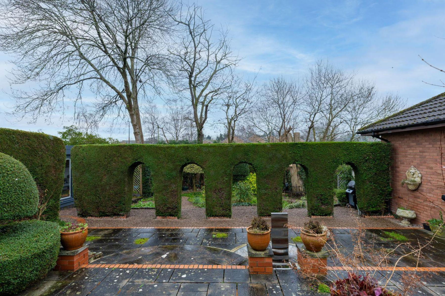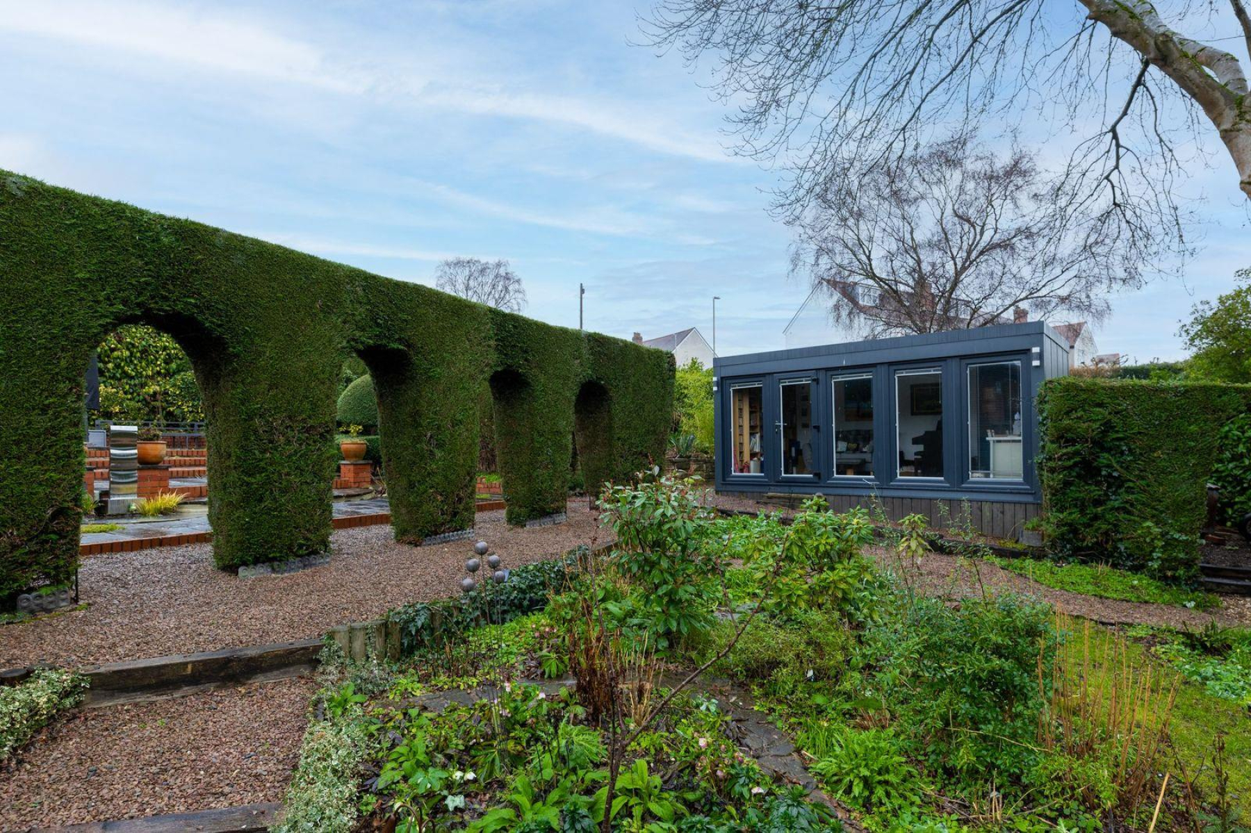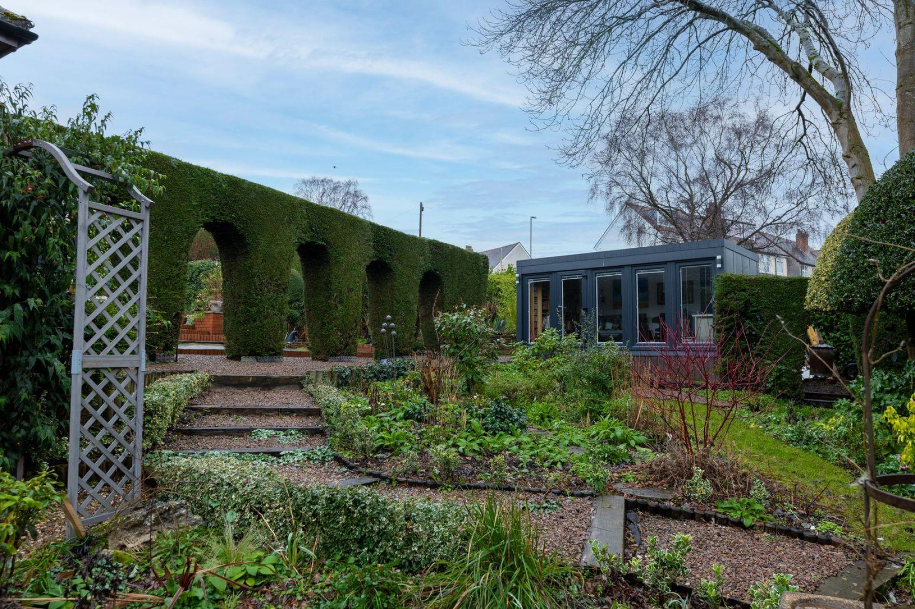 A striking architectural hedge feature with arched walkways provides a strong focal point and sense of structure, while established trees, shaped shrubs and dense hedging ensure a high degree of privacy throughout. Toward the far end of the garden sits a contemporary garden studio with glazed doors, offering an excellent space for home working or as an addition to the home.