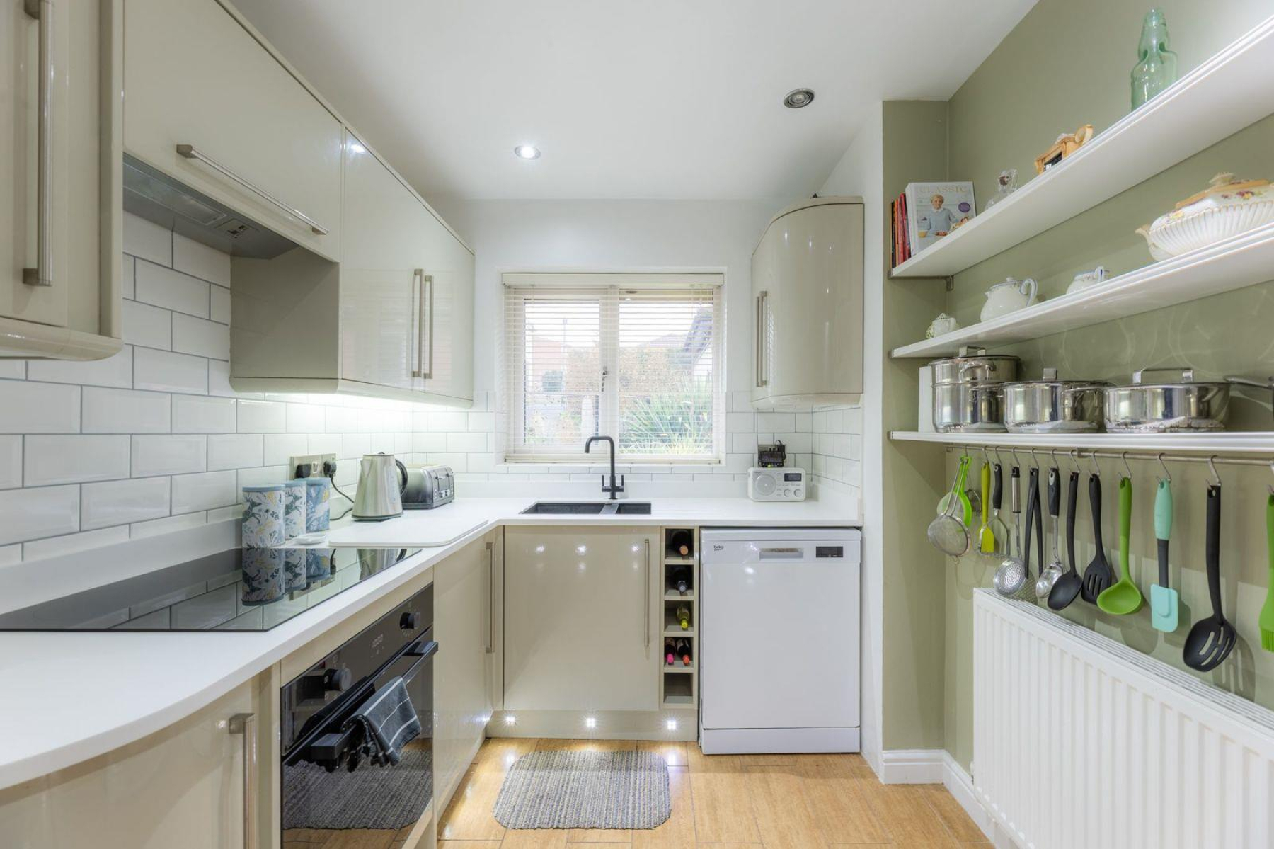 Kitchen - 3.72 x 3.70 (12'2" x 12'1") - With an opening from the entrance hall, a range of wall and base units with 12mm 'Hi-Macs' worktops, integrated appliances including fridge-freezer, oven and hob with extractor above, undermounted sink with filtered mixer tap and draining grooves, a door leading to the side access, a double glazed window to the front and a central heating radiator