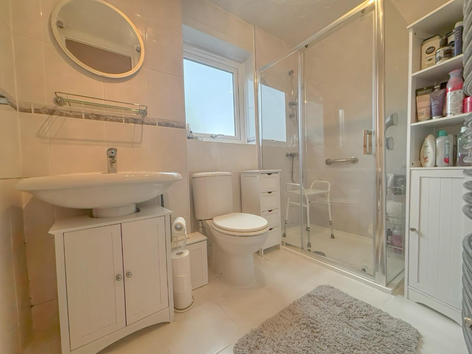 Upstairs Bathroom - 2.77m x 1.66m (9'1" x 5'5") - Modern shower room with walk-in enclosure, sink vanity unit, WC, and stylish tiling throughout. Window for natural ventilation.