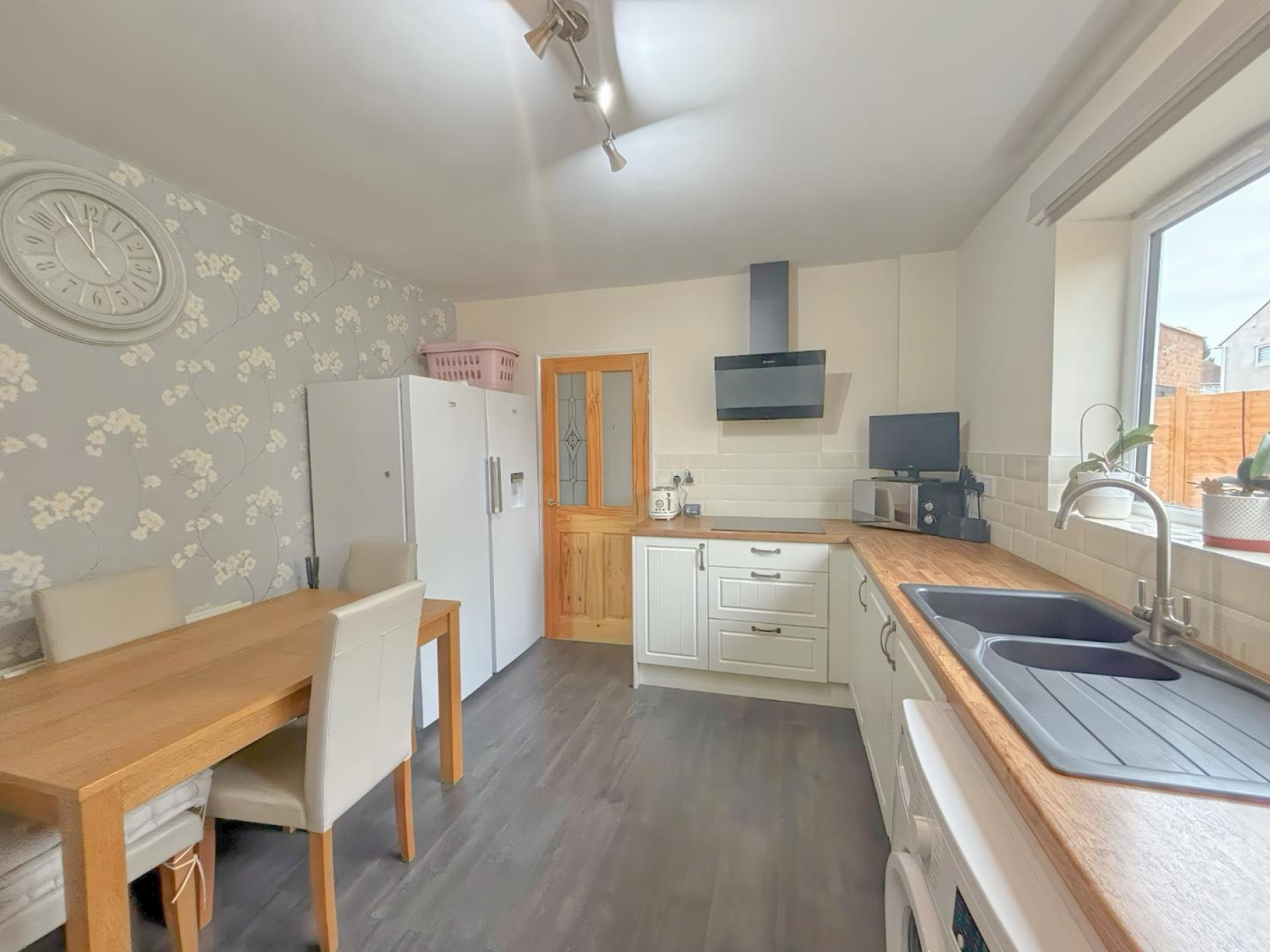 Dining Kitchen - 3.70m x 3.27m (12'1" x 10'8") - A real showstopper - this recently updated kitchen offers shaker-style cabinetry, wood-effect countertops, integrated oven, extractor, washing machine and dryer space, and a generous dining area perfect for family meals. Views and access to the rear garden.