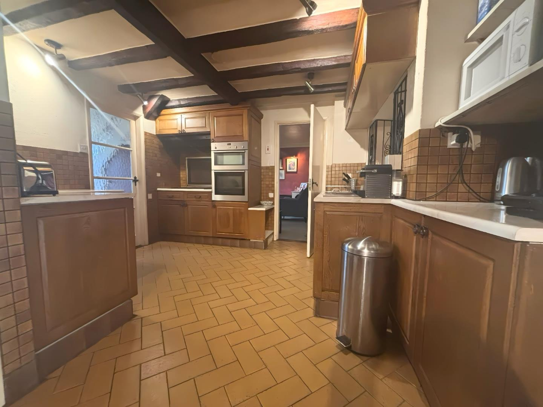 Kitchen - 2.84m x 3.77m (9'3" x 12'4") - A charming, traditional kitchen with solid wood cabinetry and exposed beams, offering both functionality and character.