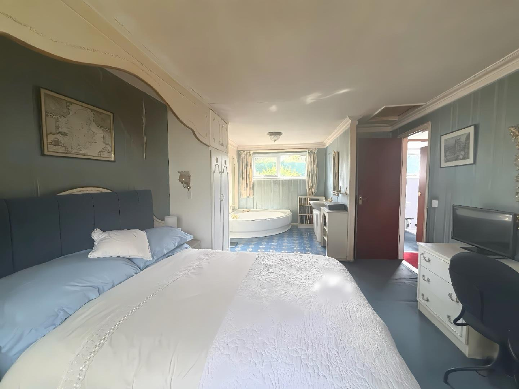 Primary Bedroom - 3.41m x 4.64m (11'2" x 15'2") - Spacious and unique bedroom featuring an open-plan ensuite area with a feature corner bath, creating a luxurious and distinctive feel.