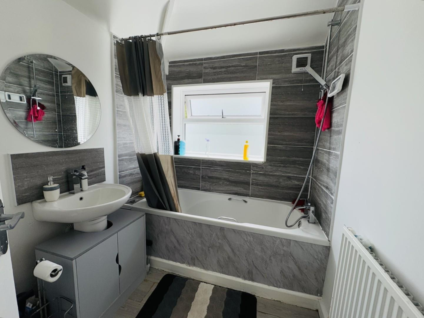 Bathroom - Contemporary white suite with bath and shower, stylish tiling, and rear window