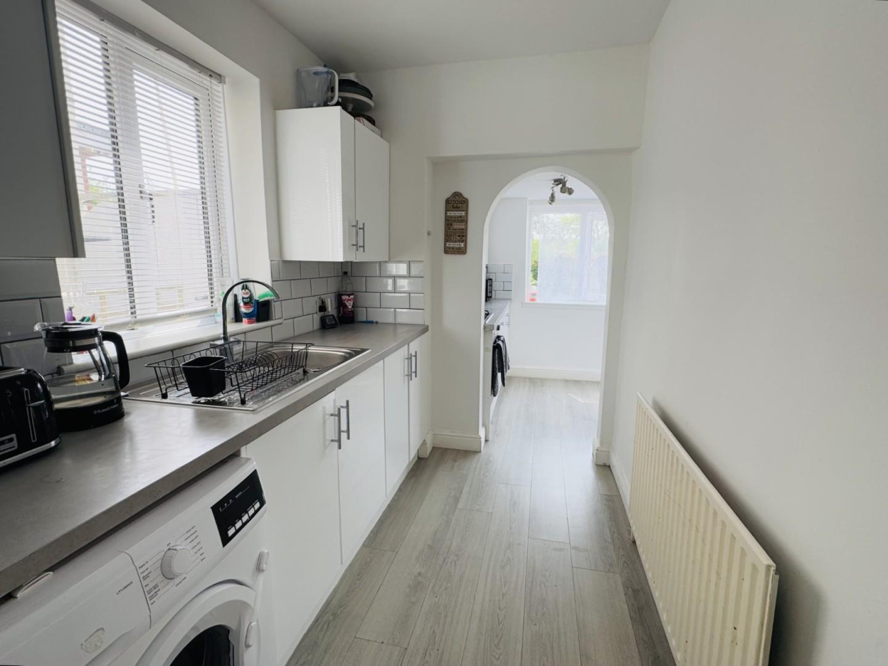 Kitchen - Modern design with integrated oven, gas hob, tiled splashbacks, and space for appliances. Dual-aspect windows and laminate flooring