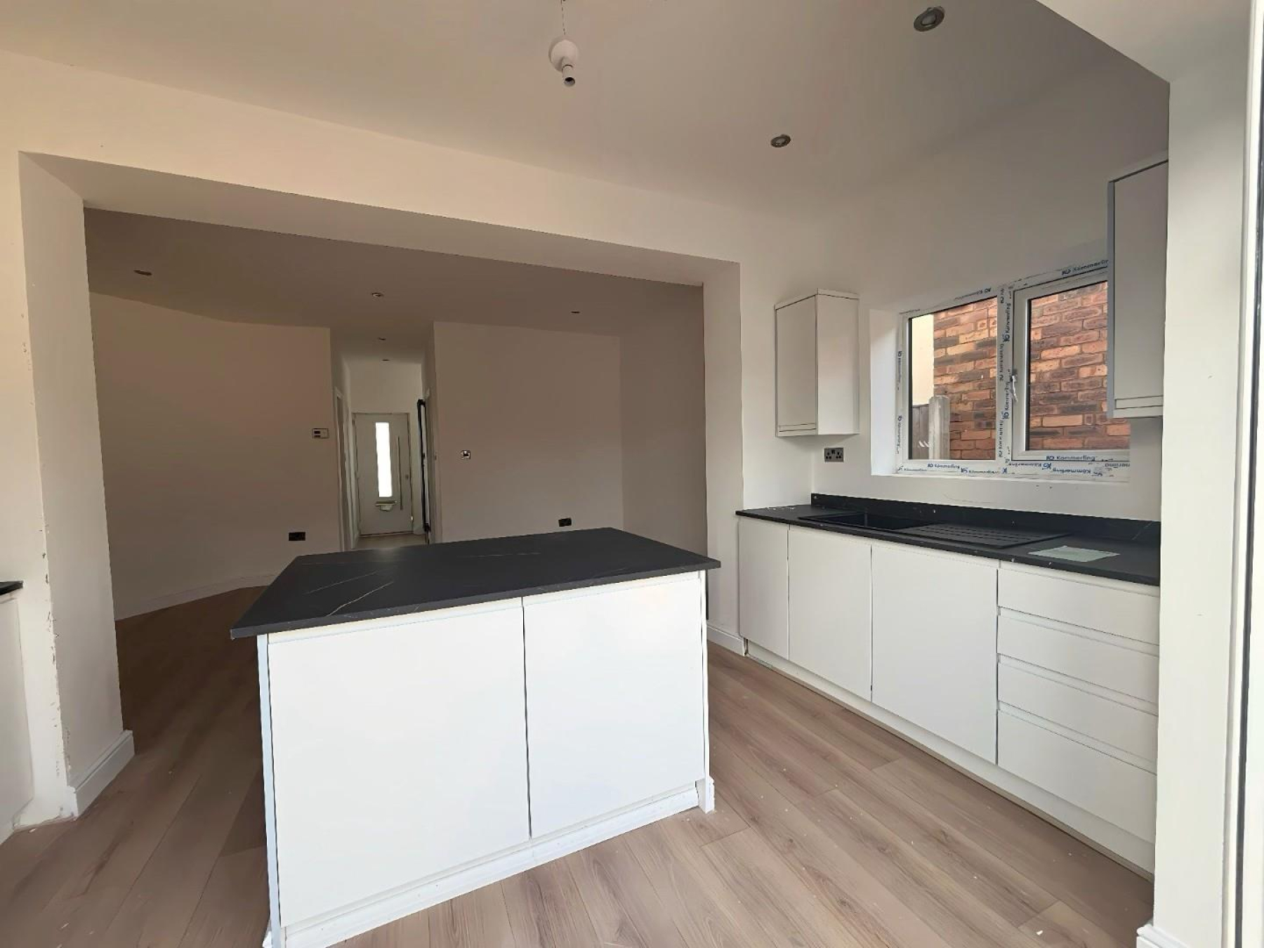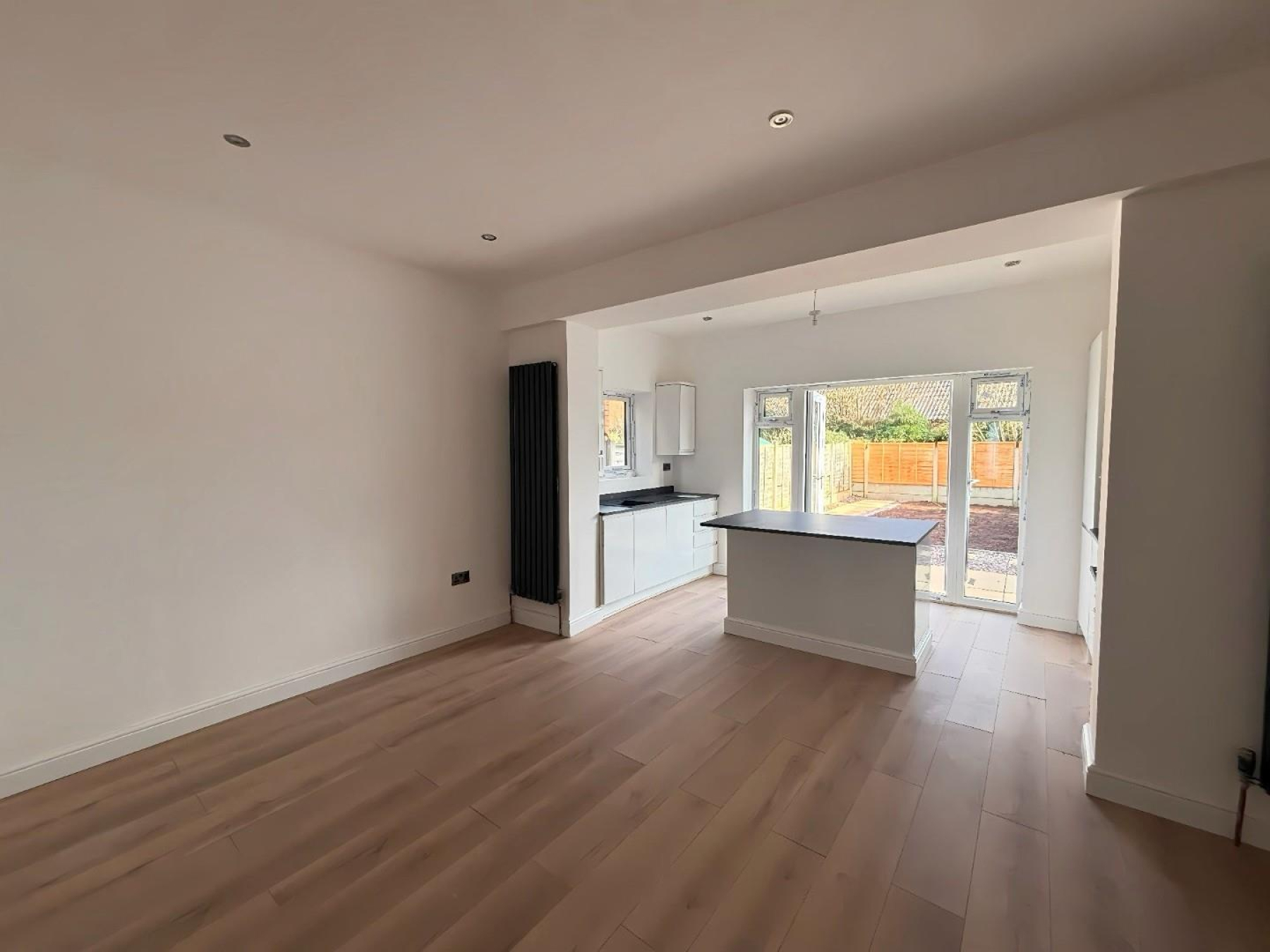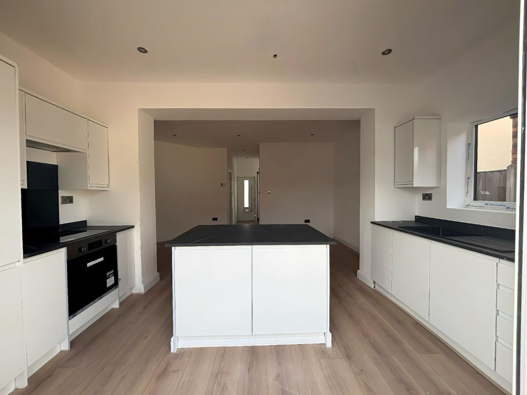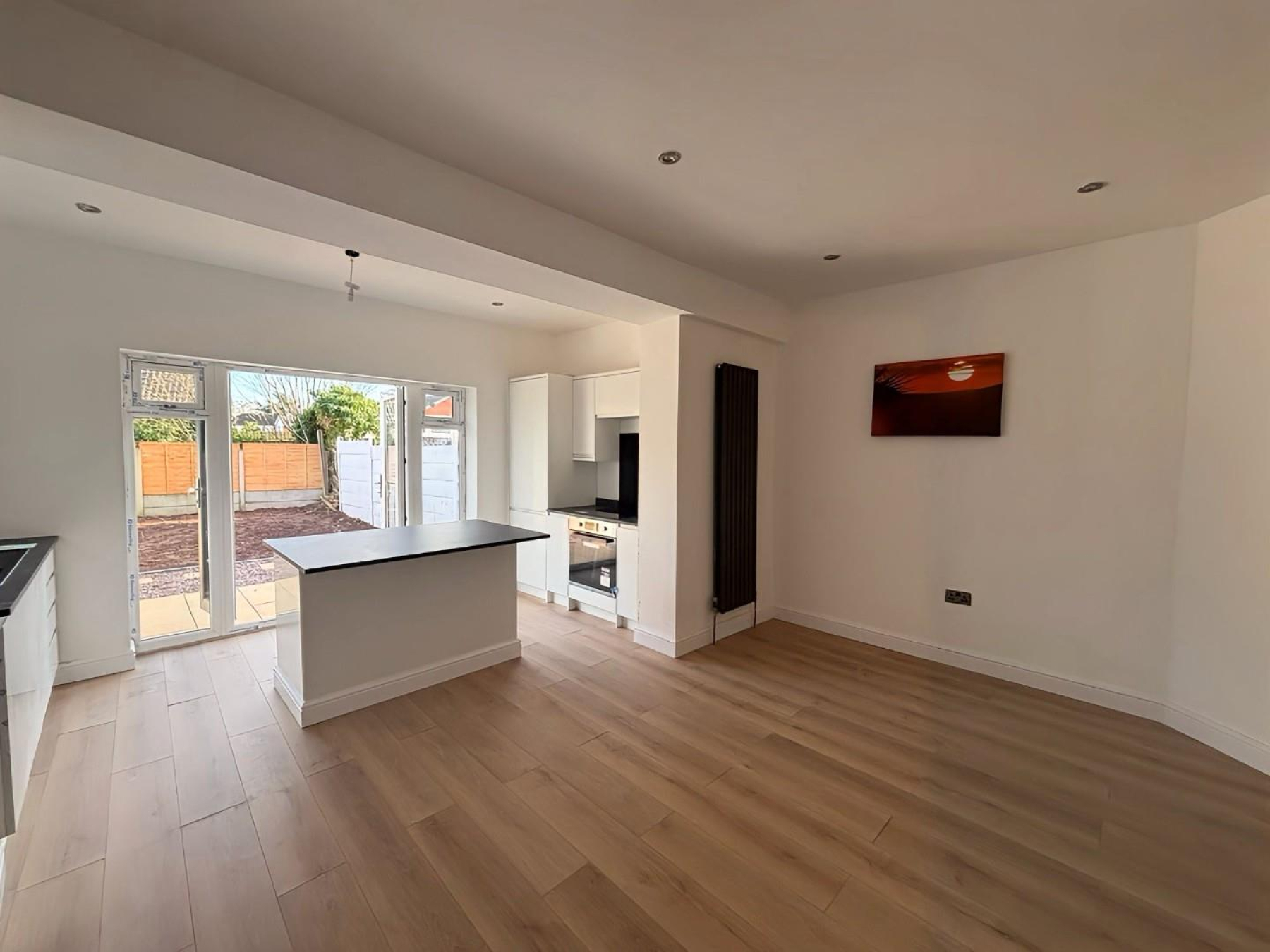 Kitchen - 3.95m x 2.08m (12'11" x 6'9") - Stunning newly fitted modern kitchen featuring sleek cabinetry, integrated oven and hob, black work surfaces, breakfast island and spotlights. Open-plan design leading directly into the extended dining/living area with rear doors to the garden - perfect for entertaining.