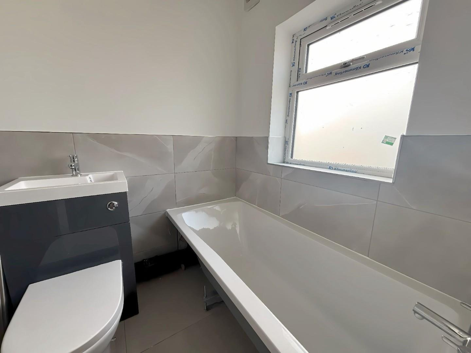 Ground Floor Bathroom - 1.59m x 1.75m (5'2" x 5'8") - Beautifully finished contemporary bathroom suite with bath, vanity unit, WC and stylish tiling.