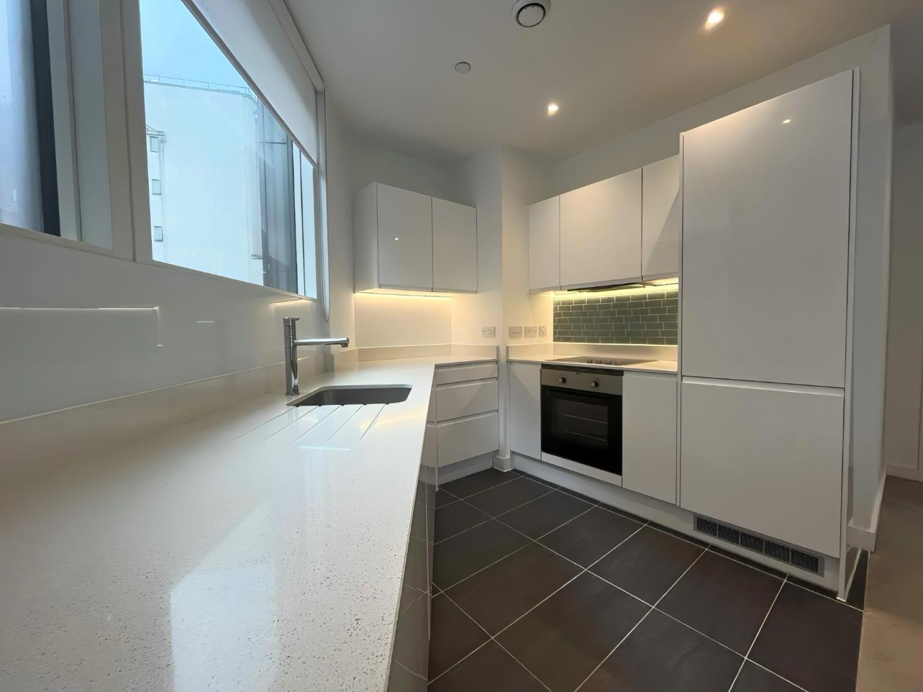 Kitchen - 3.22m x 2.67m (10'6" x 8'9") - Contemporary high-gloss kitchen with under-cabinet lighting, integrated appliances, and stone-effect countertops. Smart layout with sleek cabinetry and tiled flooring.