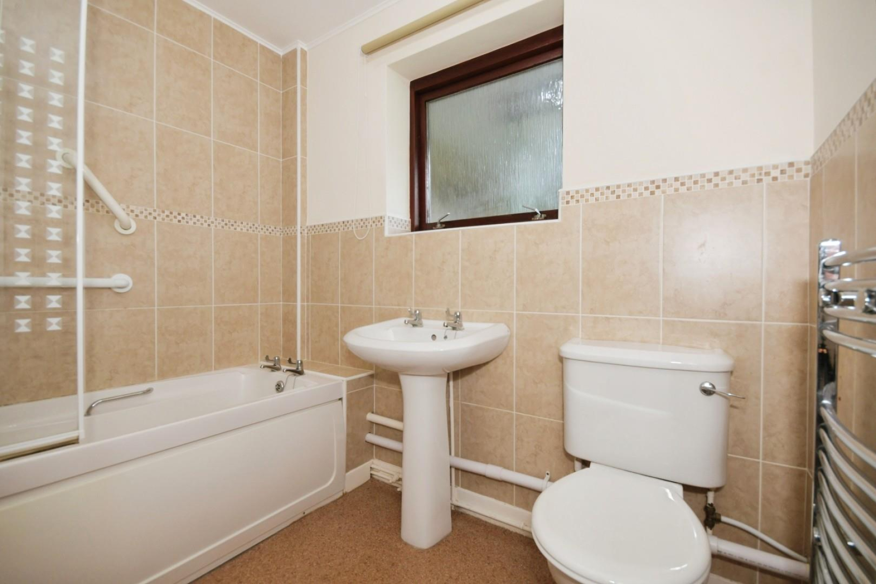 Bathroom - 2.30m x 1.80m (7'6" x 5'10") - Modern tiled bathroom with a white suite, bath with overhead shower, pedestal sink and WC. Handrails in place for additional support.