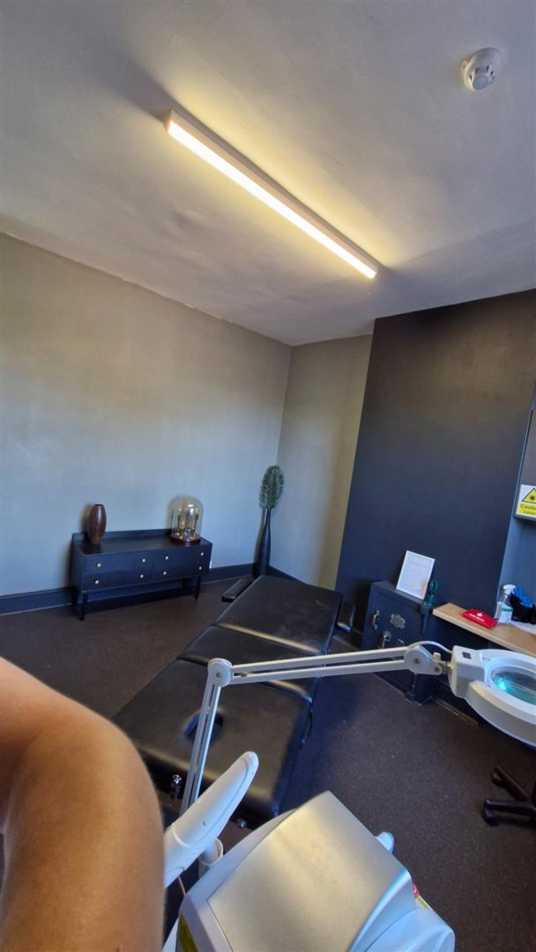 Office Space - 3.8m x 3.4m (12'5" x 11'1") - A well-proportioned and modern room with neutral grey decor and contemporary finishes. Features a large window bringing in natural light, dark flooring, and enough space for treatment equipment, desks, or consulting furniture. Currently staged with a treatment bench and lamp - ideal for health, wellness, or general office use.