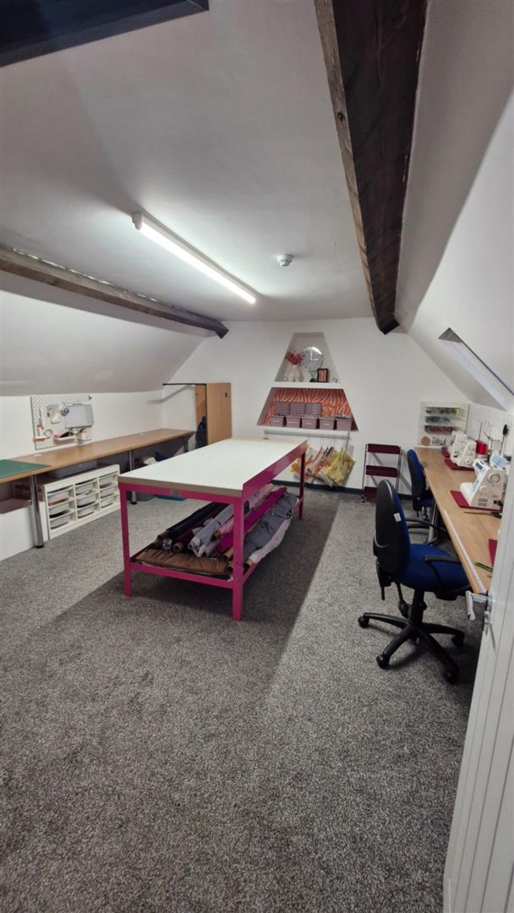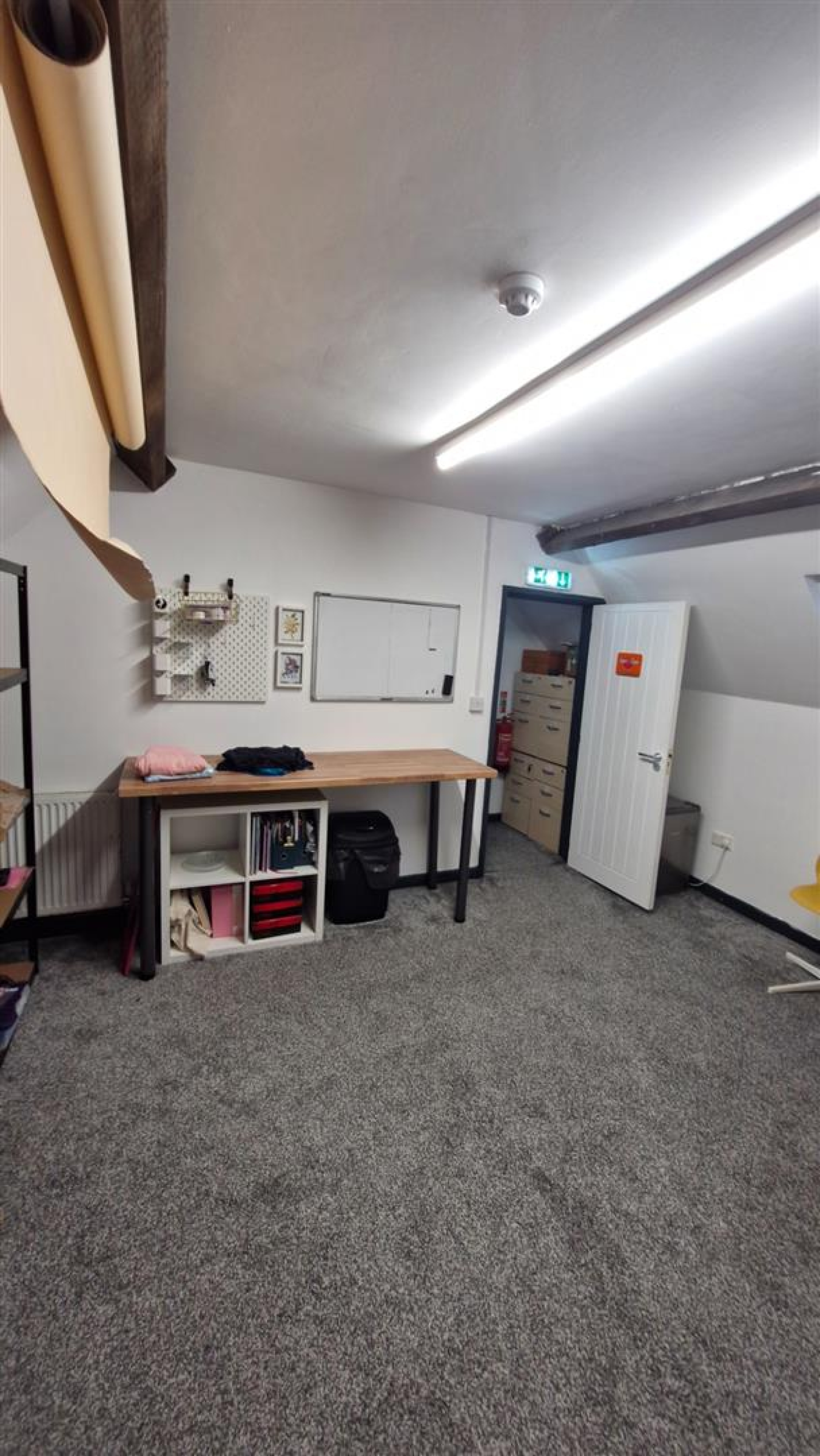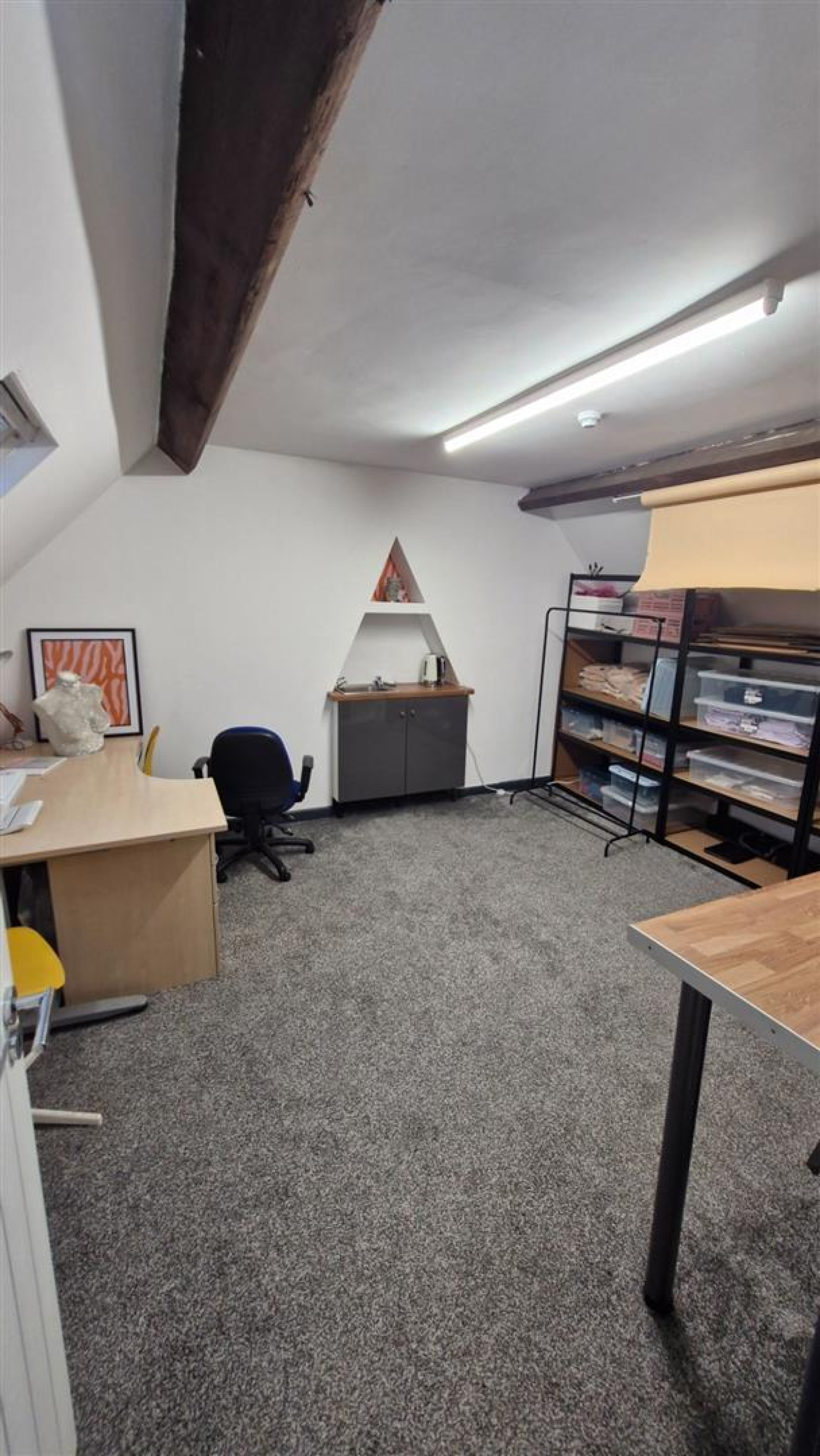 Room 1 - 4.9m x 4.5m (16'0" x 14'9") - A spacious, carpeted room with character beams and modern lighting. Ideal as a main office, open-plan workspace, or small workshop. Ample space for desks, storage, or specialist business equipment.