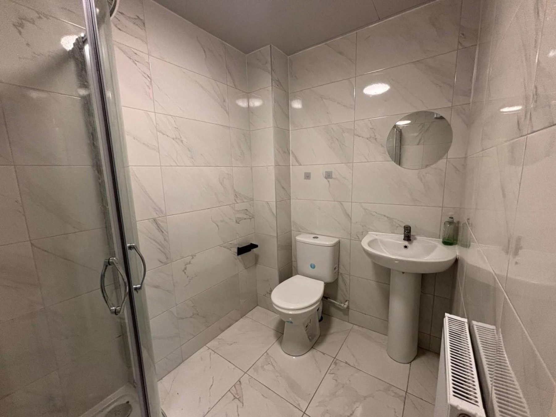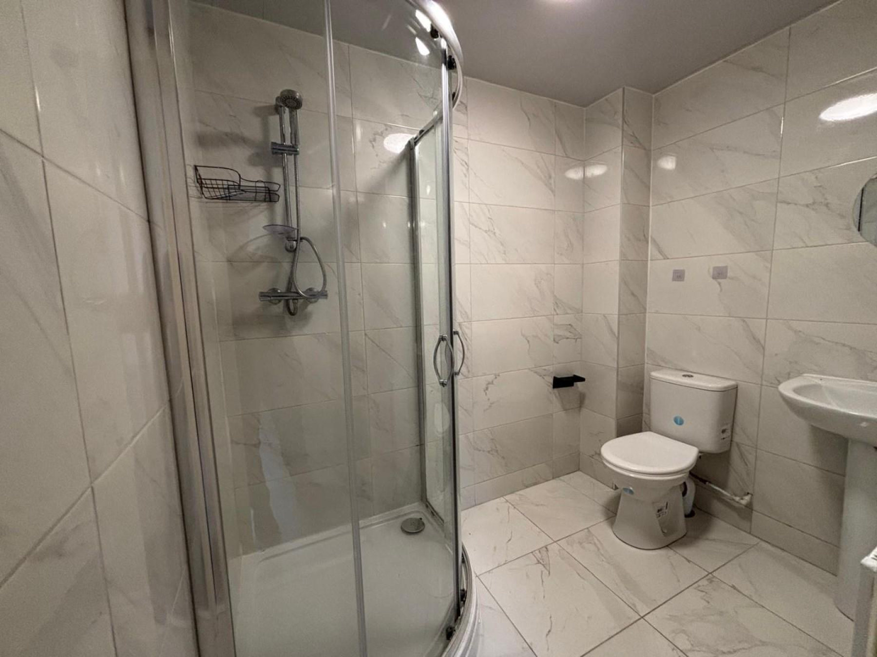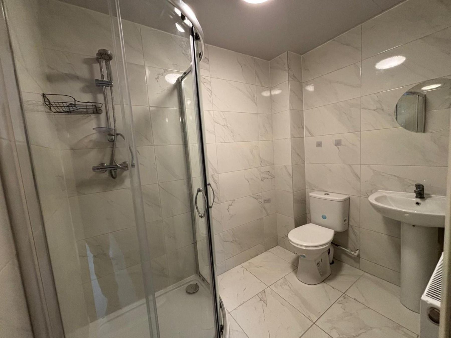 Shower Room - Modern and sleek, the shower room features a stylish walk-in shower, basin, and toilet. The walls are fully tiled with a clean marble effect for a luxurious finish.