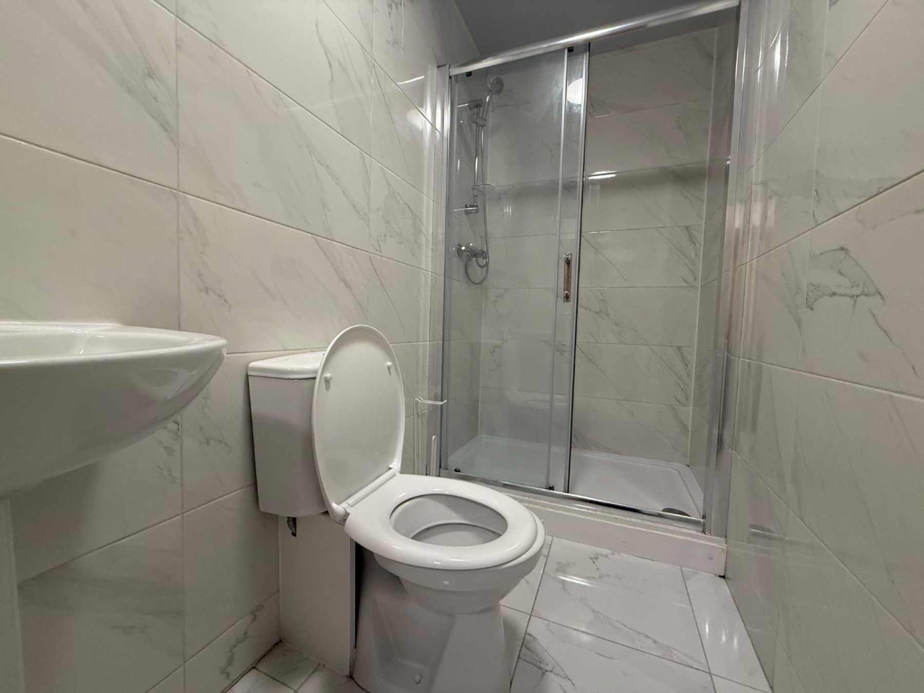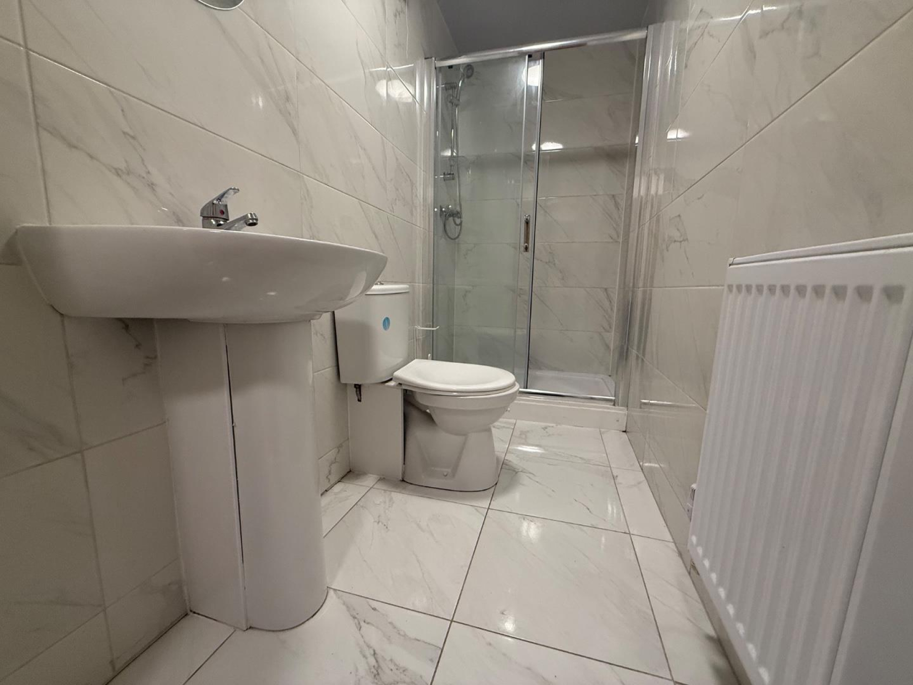 Bathroom - Fully tiled with a polished marble look, the bathroom offers a walk-in glass shower, toilet, pedestal sink, chrome towel ring, and a large wall-mounted mirror. Clean, fresh, and easy to maintain.