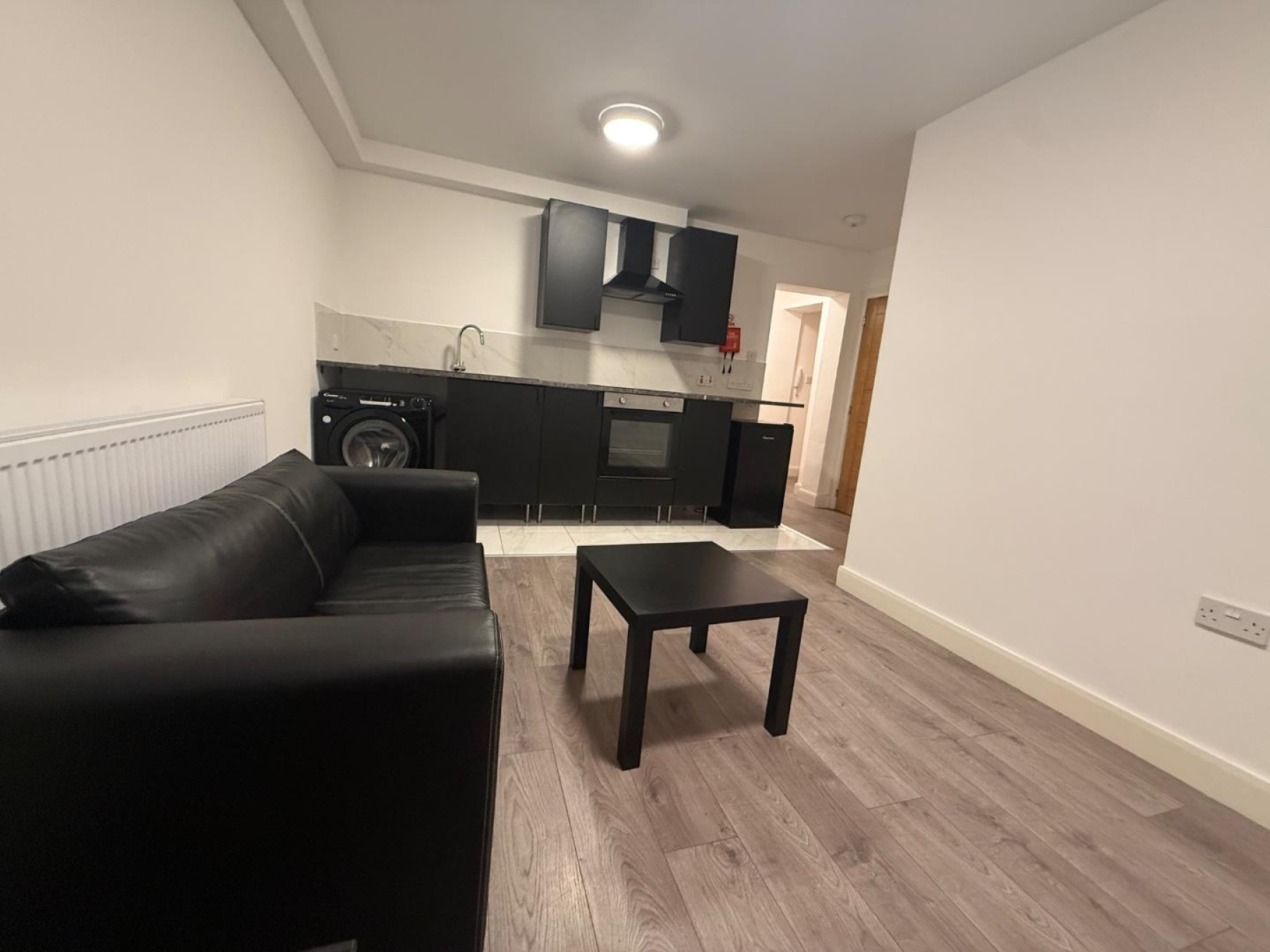 Living/Kitchen Area - Open-plan and thoughtfully designed, this space features sleek dark cabinetry, integrated oven and hob, washing machine, under-counter fridge, and tiled splashbacks. The living area is furnished with a modern black leather sofa and coffee table, set on wood-effect laminate flooring for a clean and contemporary finish.