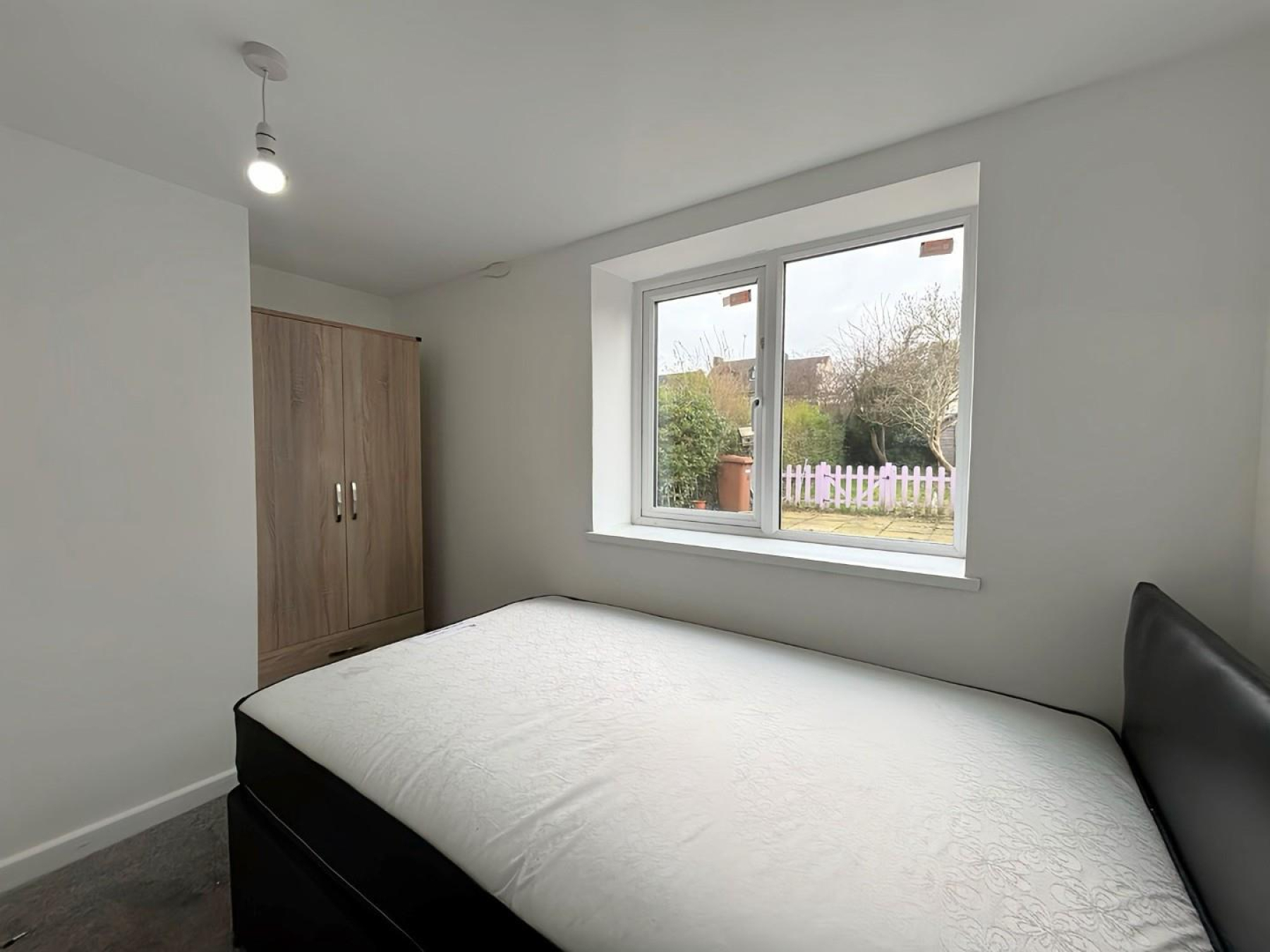 The room features modern neutral décor and benefits from natural light through a large window overlooking the rear garden.
