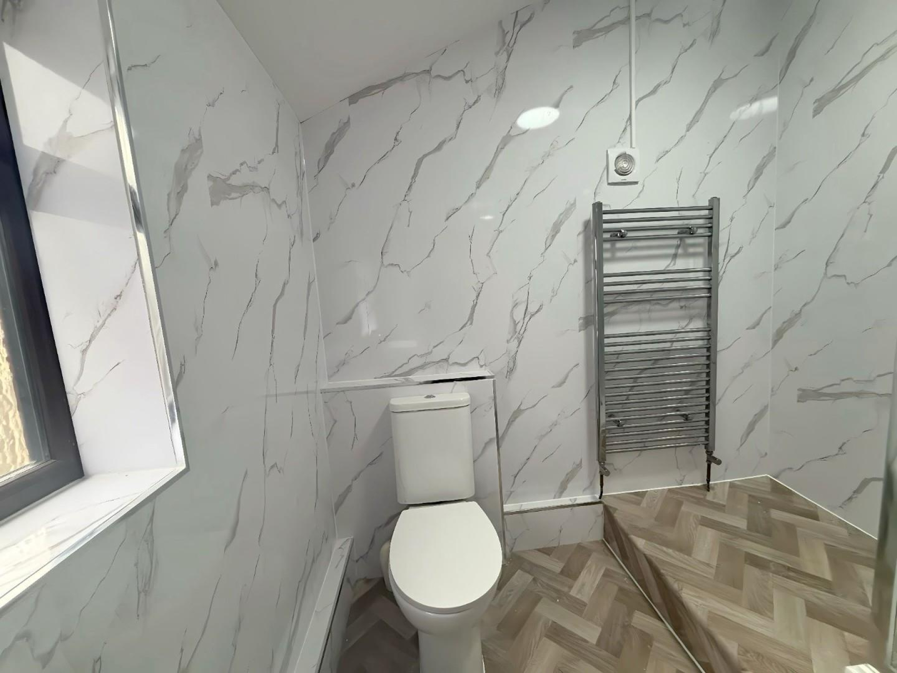Shower Room - Modern shared shower room featuring a large glass shower enclosure, wash basin with vanity unit and WC. Finished with stylish marble-effect wall panels and modern flooring.