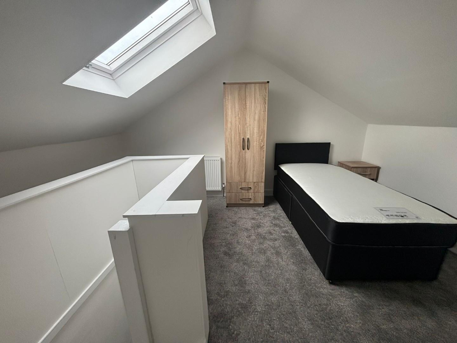 Bedroom 5 - 3.80 m x 4.67 m (12'5" m x 15'3" m) - A spacious and well-presented attic bedroom located on the top floor of this professionally managed house share. The room benefits from a large skylight window which allows plenty of natural light, creating a bright and airy living space. The room is furnished with a bed, wardrobe and bedside unit, offering comfortable accommodation.