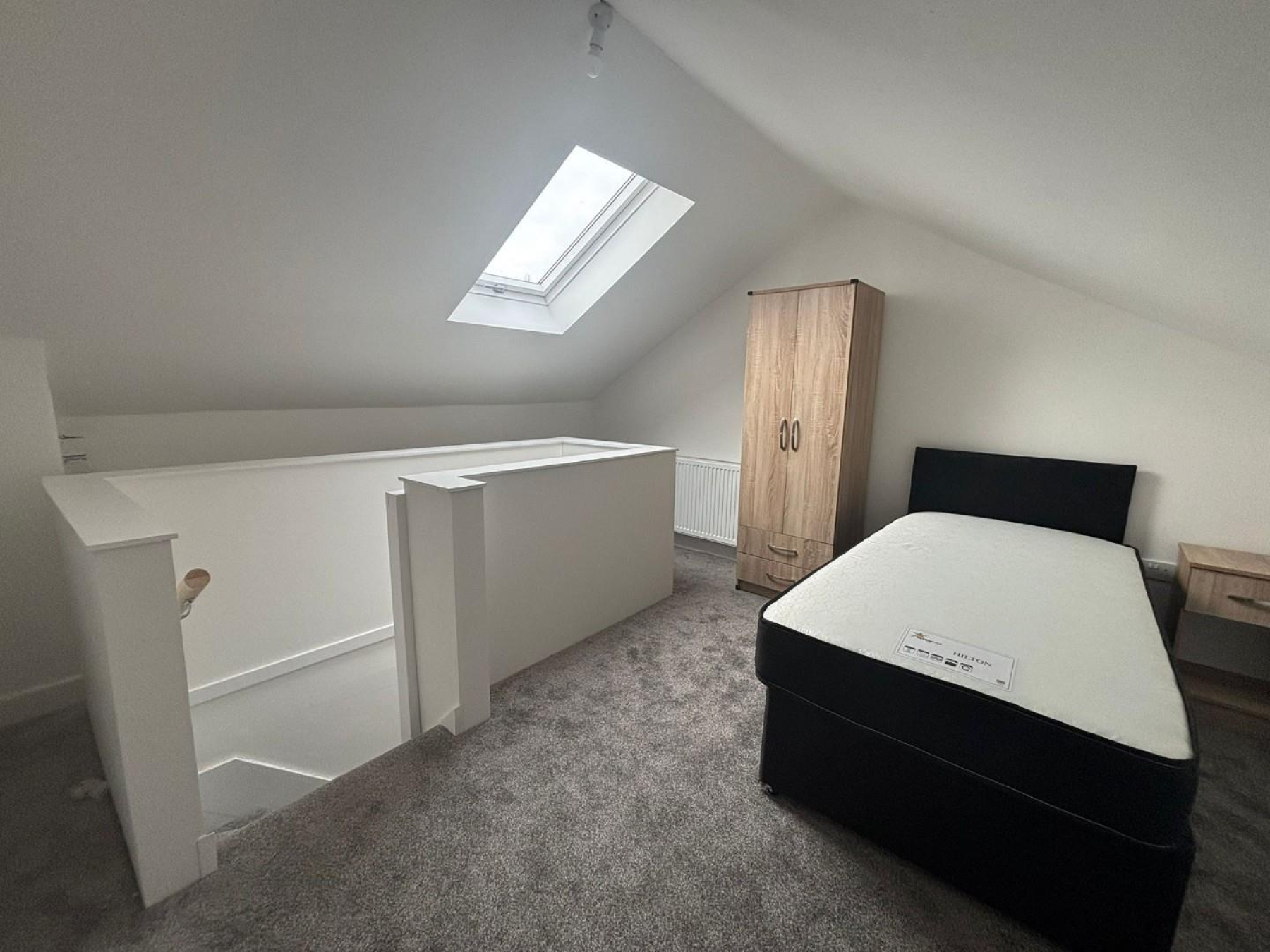 Bedroom 5 - 3.80 m x 4.67 m (12'5" m x 15'3" m) - A spacious and well-presented attic bedroom located on the top floor of this professionally managed house share. The room benefits from a large skylight window which allows plenty of natural light, creating a bright and airy living space. The room is furnished with a bed, wardrobe and bedside unit, offering comfortable accommodation.