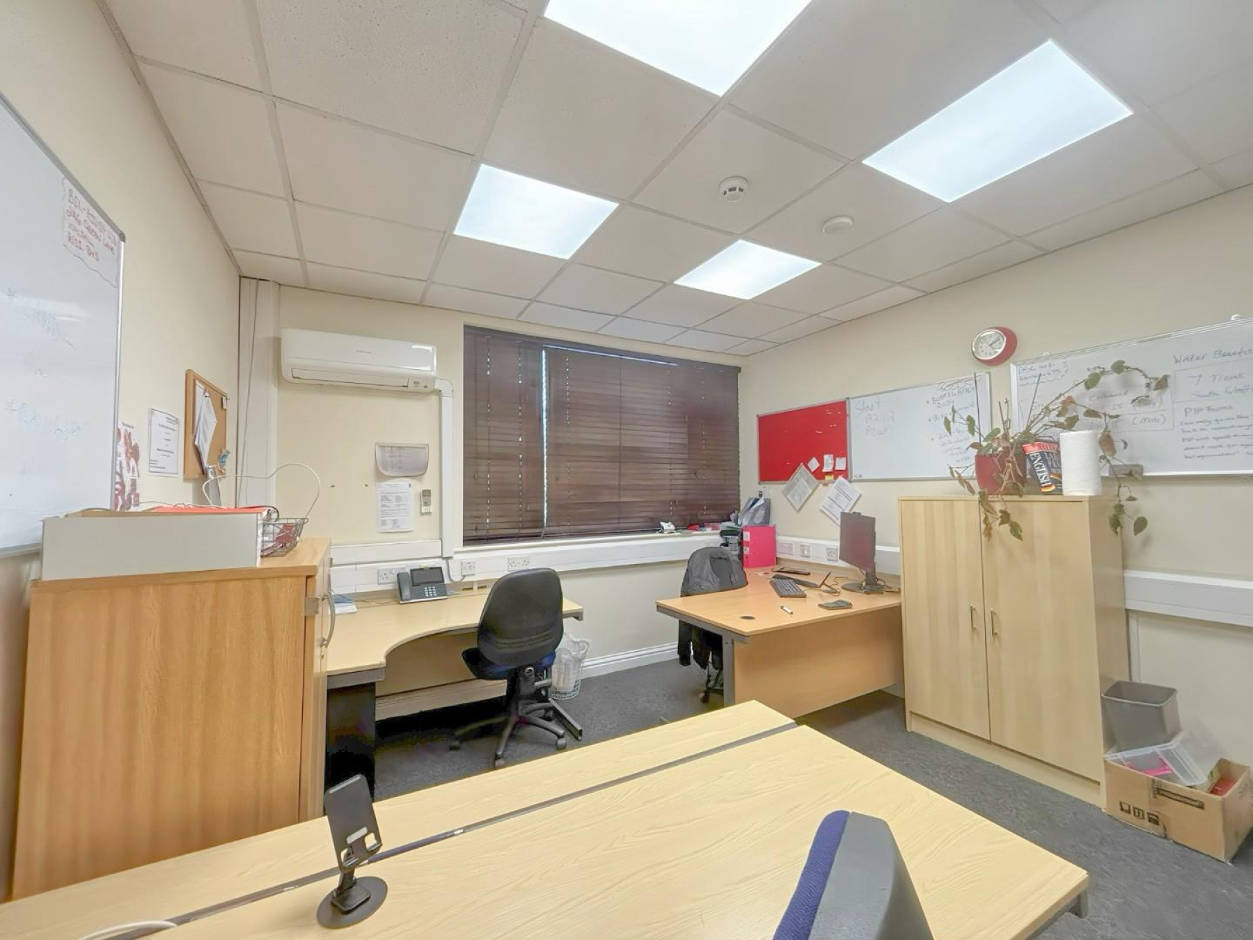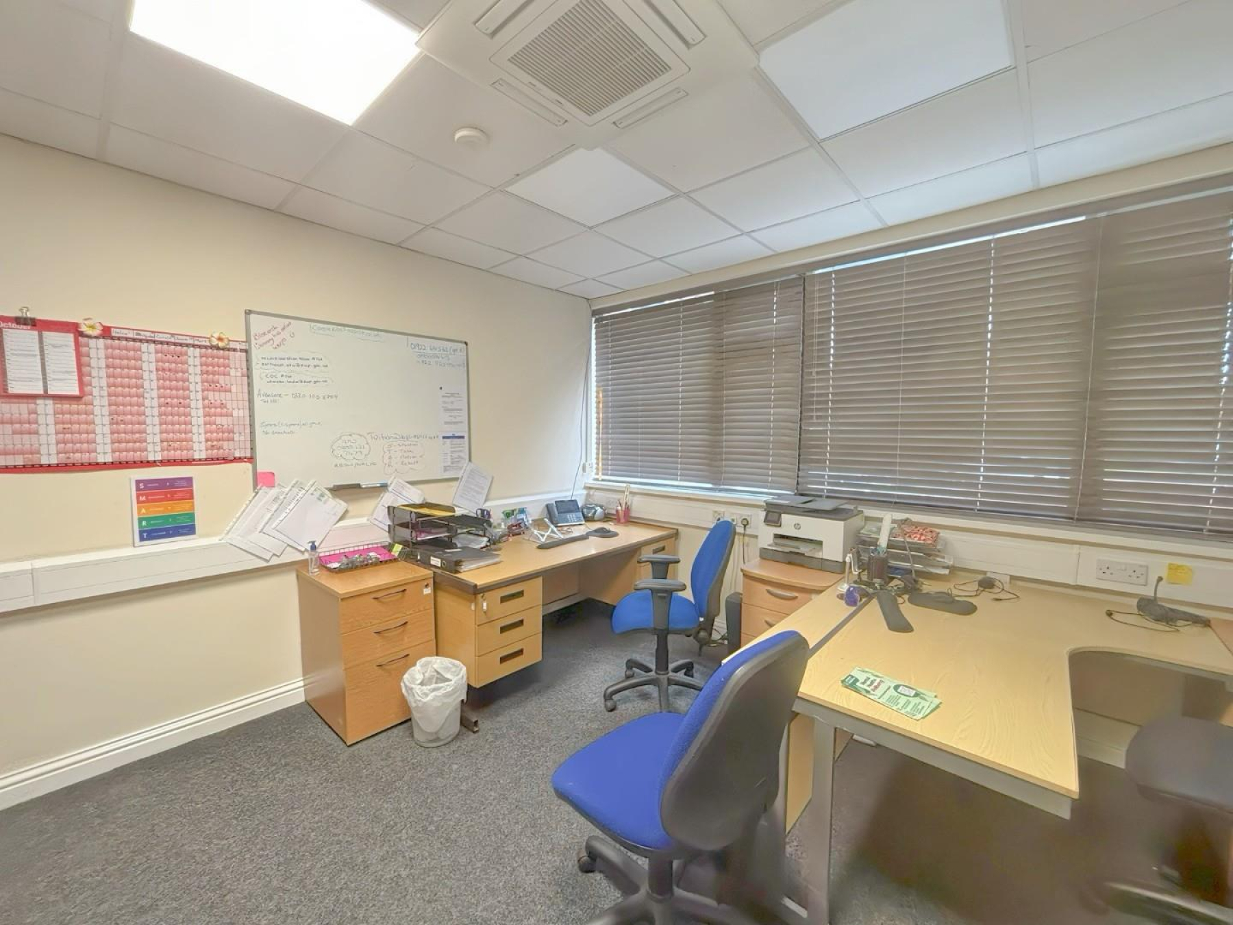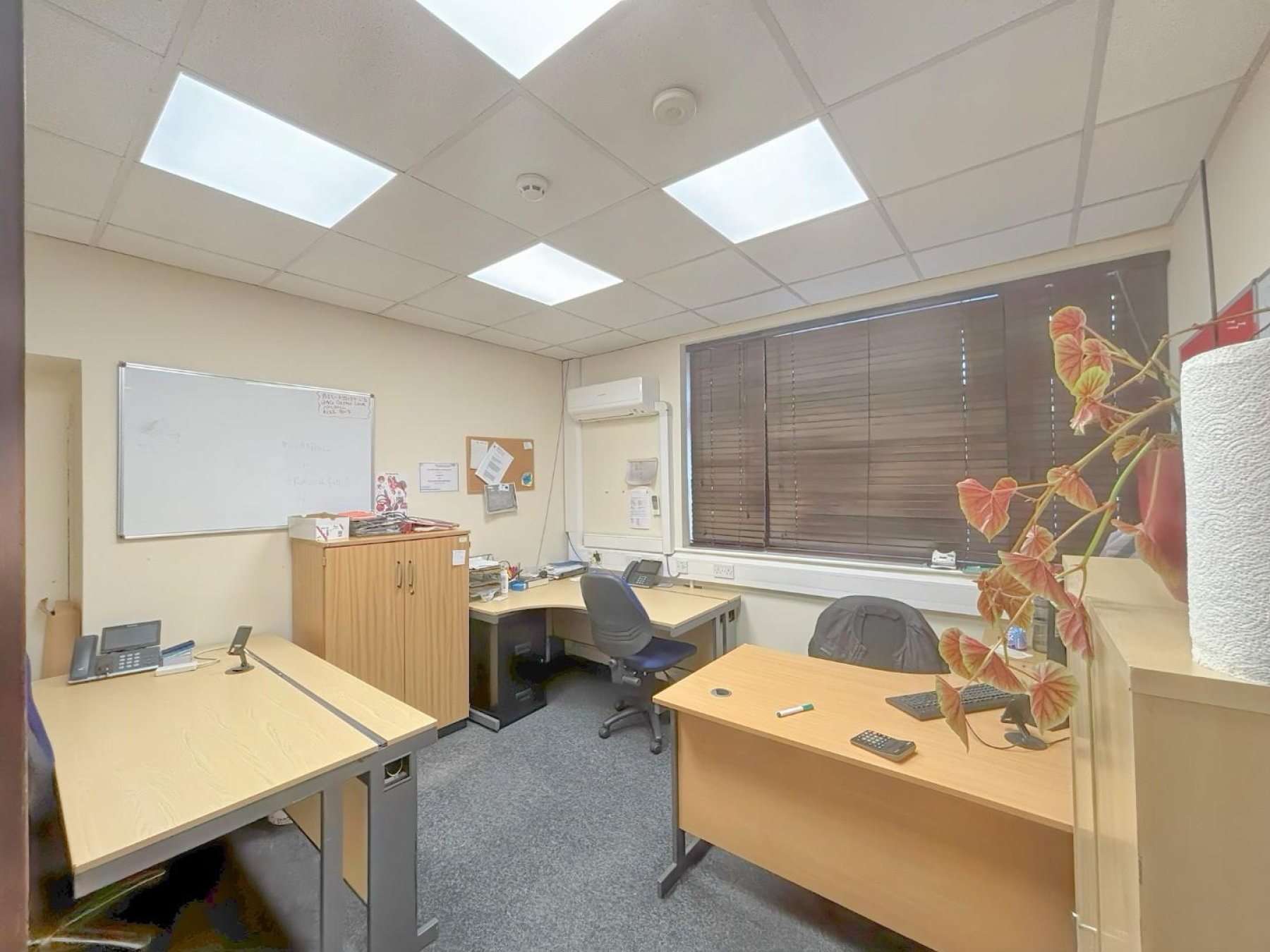 Office One - 3.80m x 3.78m (12'5" x 12'4") - Ideal for a 2-3 person team, with ample desk space, storage, and neutral decor. Large window for natural light and fitted blinds for privacy.