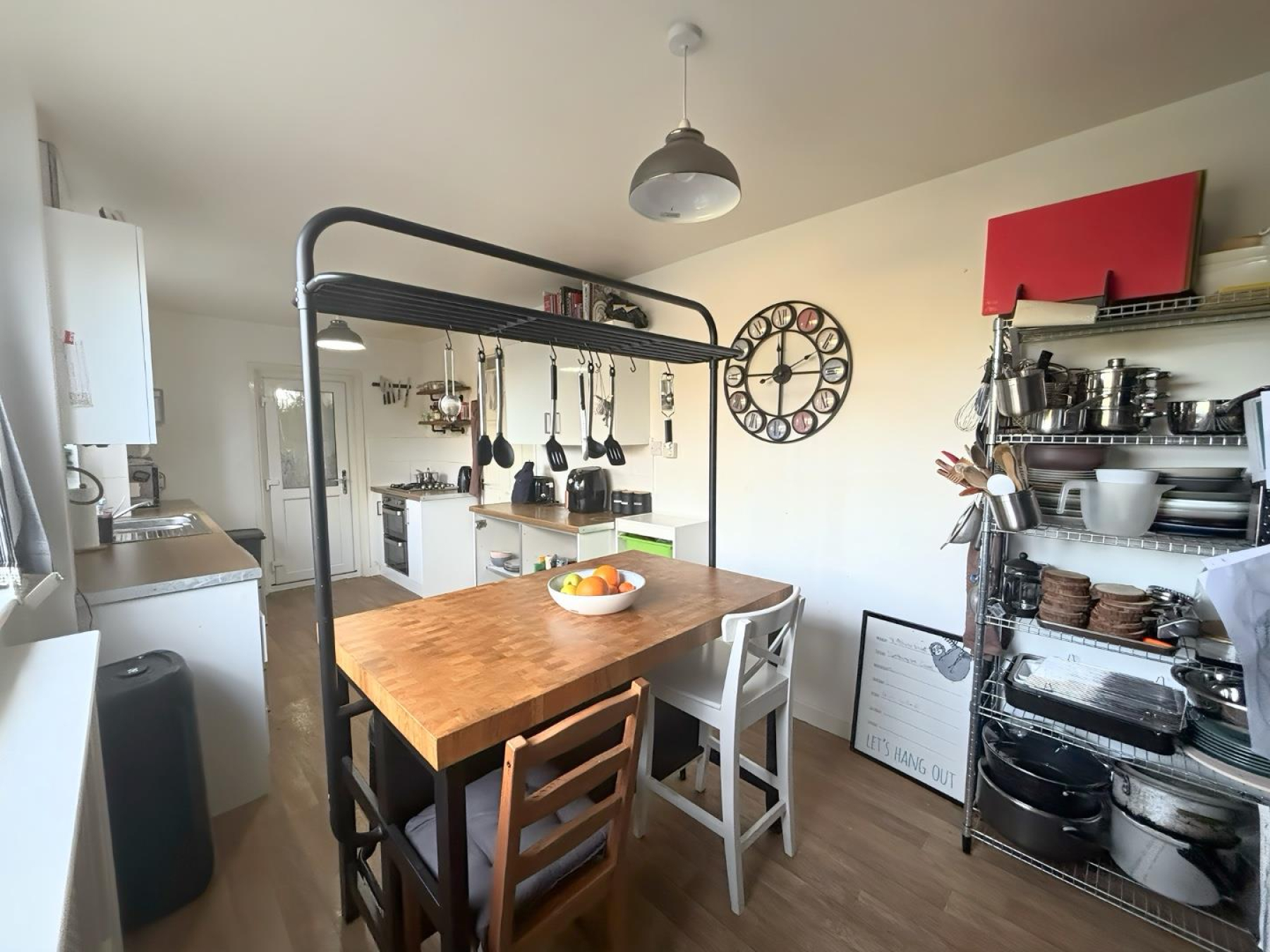 Dining Area - 2.98m x 2.38m (9'9" x 7'9") - Open-plan to the kitchen, this area features a charming central island/dining table with a practical hanging rack, ideal for families or entertaining.