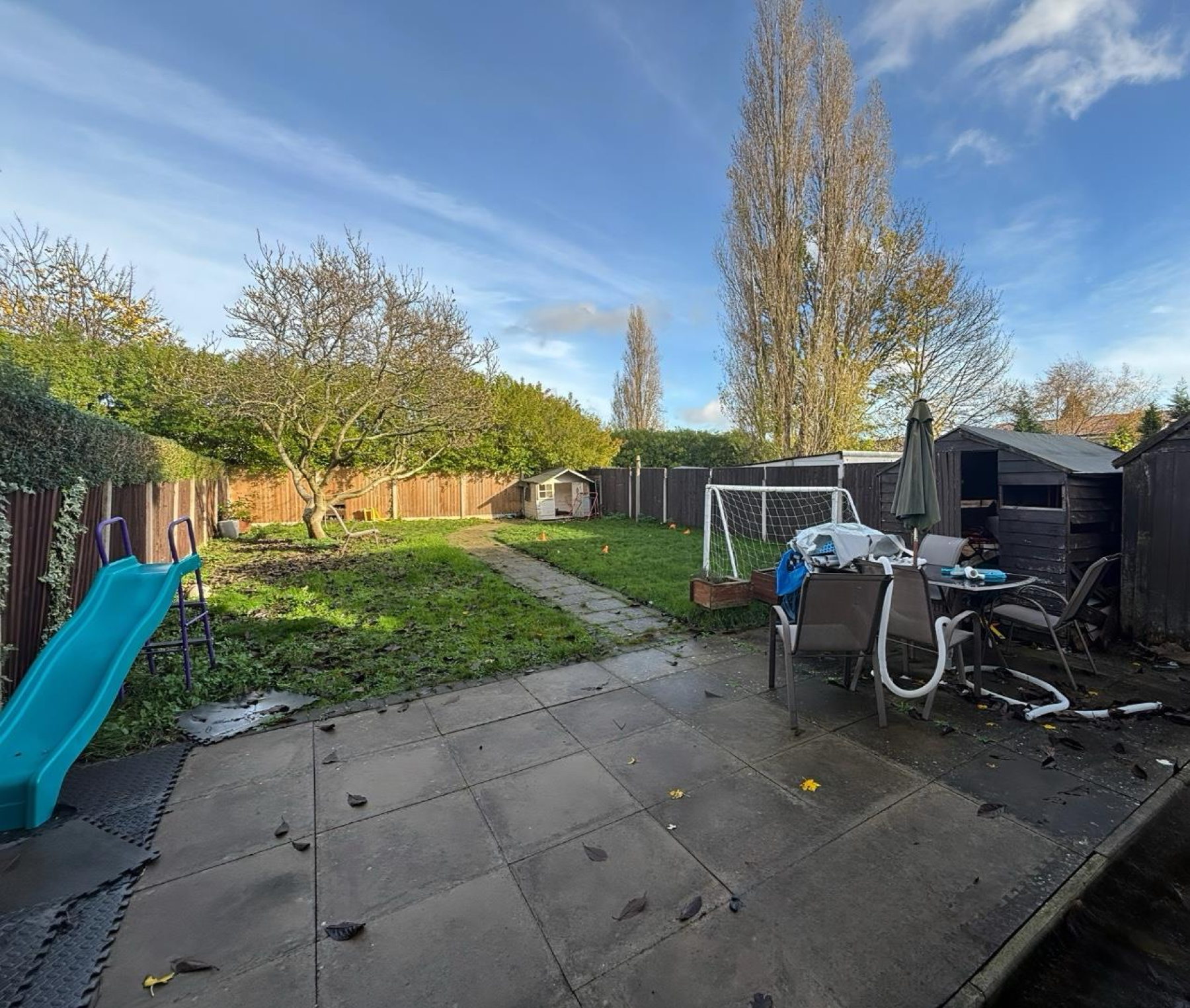 Rear Garden - A large private garden with a patio path, mature tree, and fenced perimeter. Ideal for children, entertaining, or simply relaxing outdoors.