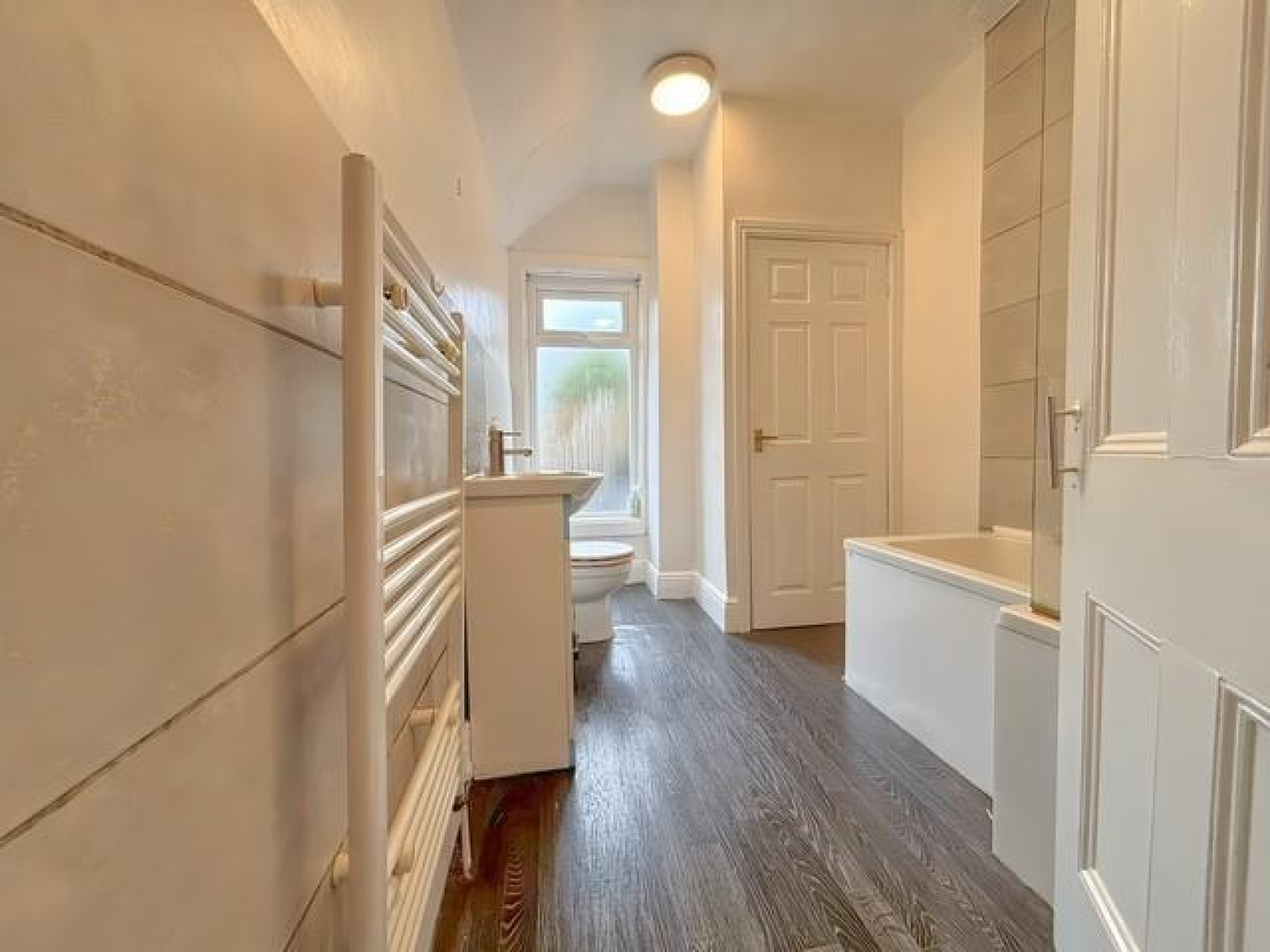 Family Bathroom - 3.51m x 2.04m (11'6" x 6'8") - Contemporary and spacious bathroom with full-length bath and overhead shower, modern tiling, sink vanity unit, WC, and heated towel rail. Natural light floods in from the large window.